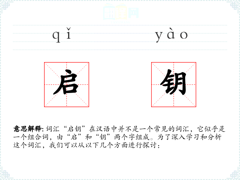 - 字面意思:“启”通常有开启、启动的意思,而“钥”则指钥匙或关键。因此,“启钥”可以理解为开启钥匙或启动关键的意思。