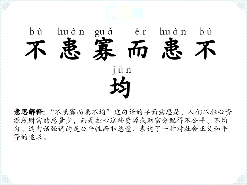 这句话源自**古代的儒家思想,特别是孔子的一些论述。在历史演变中,这句话被广泛用于各种社会和政治讨论中,成为表达对公平正义追求的一个常用表述。