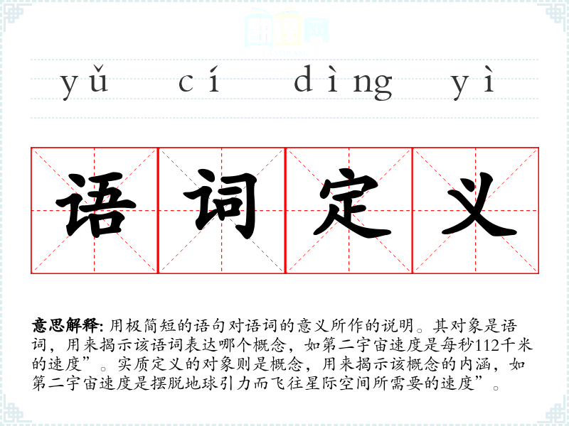 1.用极简短的语句对语词的意义所作的说明。其对象是语词,用来揭示该语词表达哪个概念,如第二宇宙速度是每秒112千米的速度”。实质定义的对象则是概念,用来揭示该概念的内涵,如第二宇宙速度是摆脱地球引力而飞往星际空间所需要的速度”。