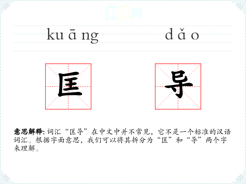 由于“匡导”不是一个常用词汇,其词源和历史演变不详。它可能是由两个常用字组合而成的新词,用于特定场合或特定领域。