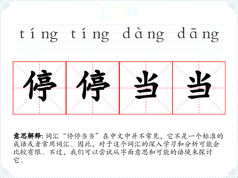 词汇“停停当当”在中文中并不常见,它不是一个标准的成语或者常用词汇。因此,对于这个词汇的深入学习和分析可能会比较有限。不过,我们可以尝试从字面意思和可能的语境来探讨它。