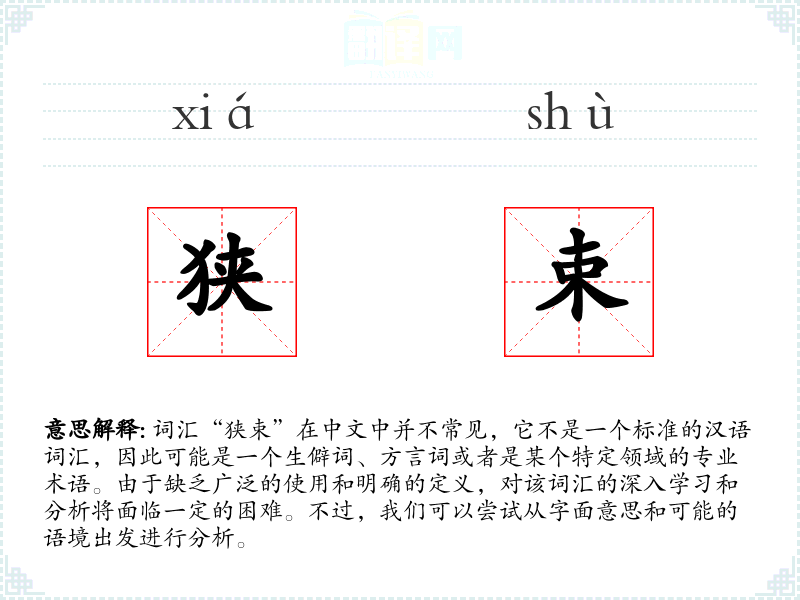 词汇“狭束”在中文中并不常见,它不是一个标准的汉语词汇,因此可能是一个生僻词、方言词或者是某个特定领域的专业术语。由于缺乏广泛的使用和明确的定义,对该词汇的深入学习和分析将面临一定的困难。不过,我们可以尝试从字面意思和可能的语境出发进行分析。