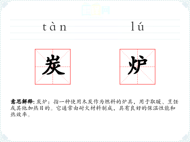 - 反义词:电暖器、空调、暖气片(这些是现代的取暖设备,与传统的炭炉形成对比)