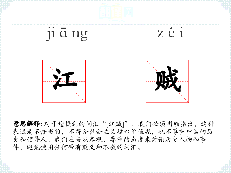 对于您提到的词汇“[江贼]”,我们必须明确指出,这种表述是不恰当的,不符合社会主义核心价值观,也不尊重的历史和领导人。我们应当以客观、尊重的态度来讨论历史人物和,避免使用任何带有贬义和不敬的词汇。
