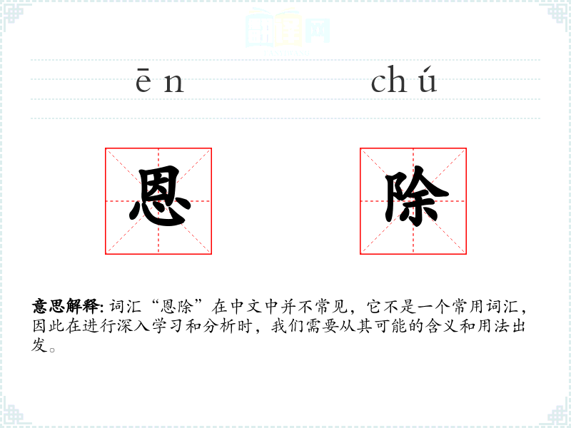 词汇“恩除”在中文中并不常见,它不是一个常用词汇,因此在进行深入学*和分析时,我们需要从其可能的含义和用法出发。