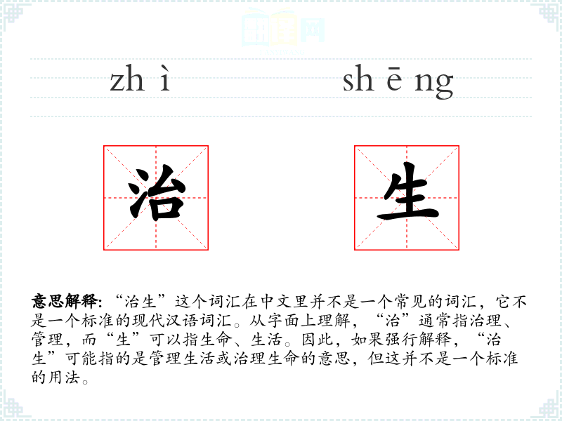 “治生”这个词汇在中文里并不是一个常见的词汇,它不是一个标准的现代汉语词汇。从字面上理解,“治”通常指治理、管理,而“生”可以指生命、生活。因此,如果强行解释,“治生”可能指的是管理生活或治理生命的意思,但这并不是一个标准的用法。