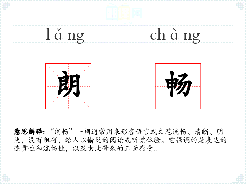 “朗畅”一词通常用来形容语言或文笔流畅、清晰、明快,没有阻碍,给人以愉悦的阅读或听觉体验。它强调的是表达的连贯性和流畅性,以及由此带来的正面感受。
