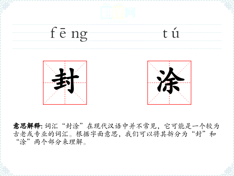 词汇“封涂”在现代汉语中并不常见,它可能是一个较为古老或专业的词汇。根据字面意思,我们可以将其拆分为“封”和“涂”两个部分来理解。