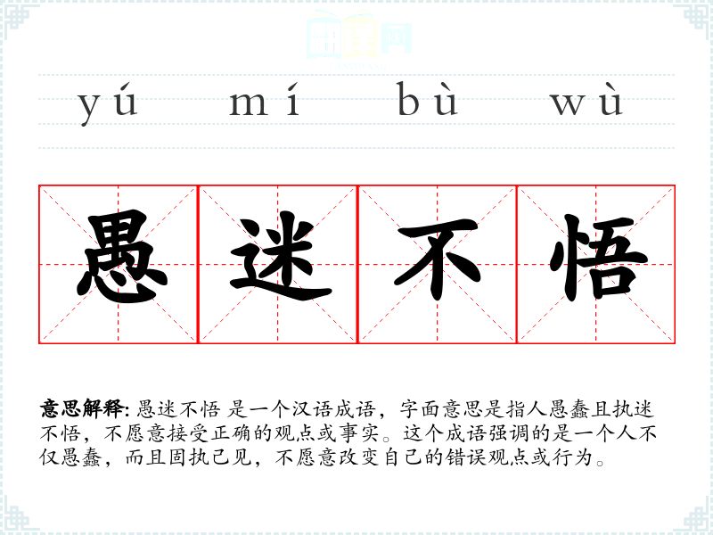 愚迷不悟 是一个汉语成语,字面意思是指人愚蠢且执迷不悟,不愿意接受正确的观点或事实。这个成语强调的是一个人不仅愚蠢,而且固执己见,不愿意改变自己的错误观点或行为。