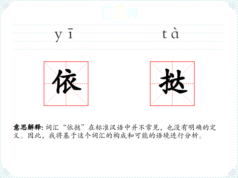 由于“依挞”不是一个标准词汇,我们可以尝试从字面上理解它。其中,“依”通常表示依赖、依靠,而“挞”则有鞭打、打击的意思。结合这两个字,我们可以推测“依挞”可能指的是一种依赖性的打击或影响。