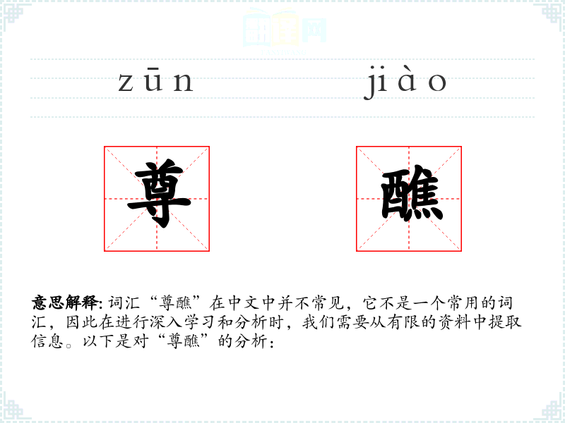 词汇“尊醮”在中文中并不常见,它不是一个常用的词汇,因此在进行深入学*和分析时,我们需要从有限的资料中提取信息。以下是对“尊醮”的分析:
