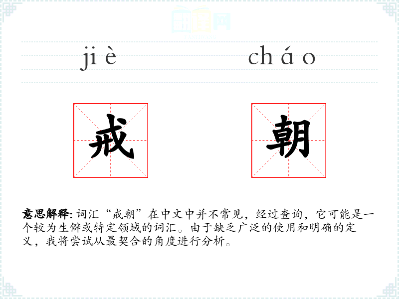 词汇“戒朝”在中文中并不常见,经过查询,它可能是一个较为生僻或特定领域的词汇。由于缺乏广泛的使用和明确的定义,我将尝试从最契合的角度进行分析。