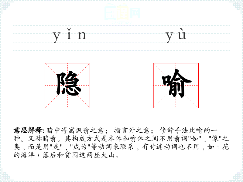1.暗中寄寓讽喻之意; 指言外之意; 修辞手法比喻的一种。又称暗喻。其构成方式是本体和喻体之间不用喻词"如"﹑"像"之类﹐而是用"是"﹑"成为"等动词来联系﹐有时连动词也不用﹐如﹕花的海洋﹔落后和贫困这两座大山。