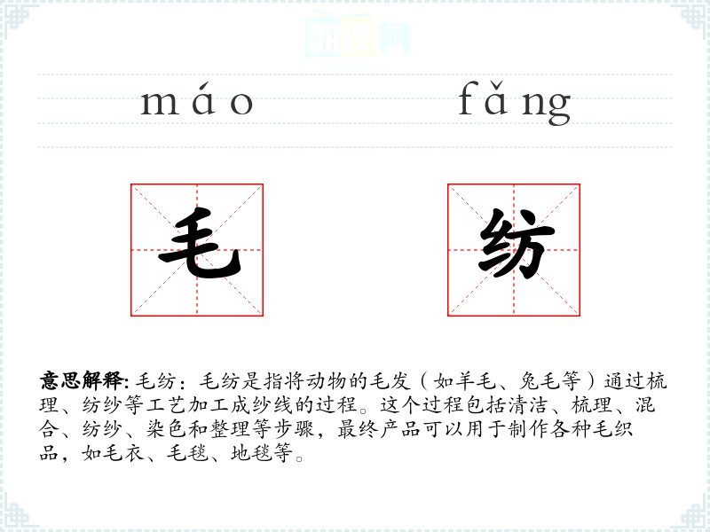 - 反义词:棉纺、麻纺、化纤纺(这些是非毛纺的纺织工艺)