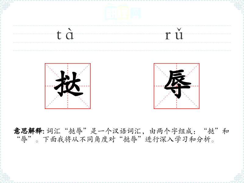 词汇“挞辱”是一个汉语词汇,由两个字组成:“挞”和“辱”。下面我将从不同角度对“挞辱”进行深入学*和分析。