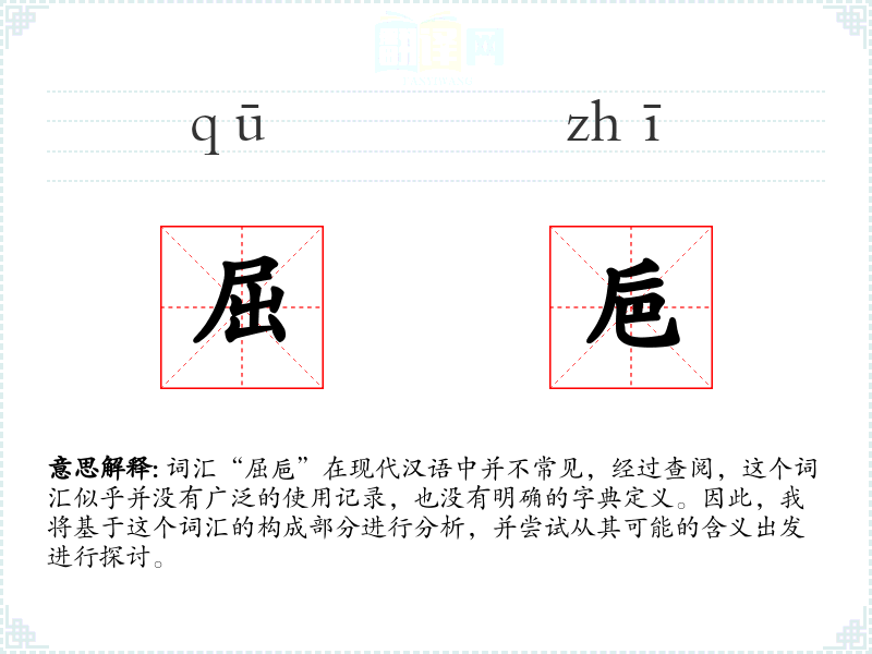 词汇“屈巵”在现代汉语中并不常见,经过查阅,这个词汇似乎并没有广泛的使用记录,也没有明确的字典定义。因此,我将基于这个词汇的构成部分进行分析,并尝试从其可能的含义出发进行探讨。