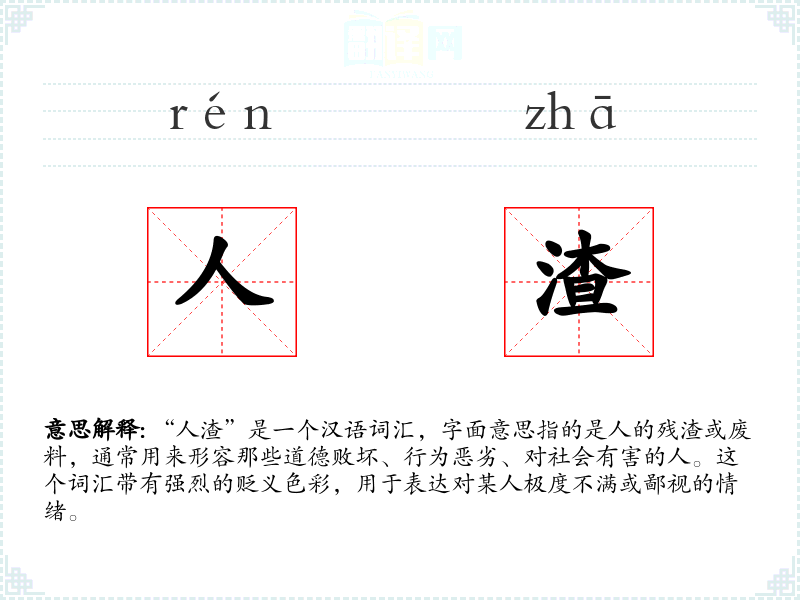“人渣”是一个汉语词汇,字面意思指的是人的残渣或废料,通常用来形容那些道德败坏、行为恶劣、对社会有害的人。这个词汇带有强烈的贬义色彩,用于表达对某人极度不满或鄙视的情绪。