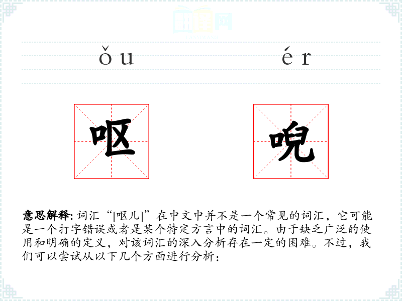 词汇“[呕儿]”在中文中并不是一个常见的词汇,它可能是一个打字错误或者是某个特定方言中的词汇。由于缺乏广泛的使用和明确的定义,对该词汇的深入分析存在一定的困难。不过,我们可以尝试从以下几个方面进行分析: