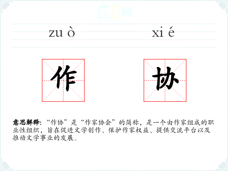 “作协”是“作家协会”的简称,是一个由作家组成的职业性组织,旨在促进文学创作、保护作家权益、提供交流平台以及推动文学事业的发展。