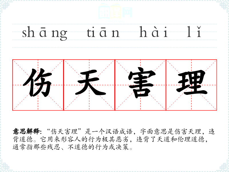 “伤天害理”是一个汉语成语,字面意思是伤害天理,违背道德。它用来形容人的行为极其恶劣,违背了天道和伦理道德,通常指那些残忍、不道德的行为或决策。