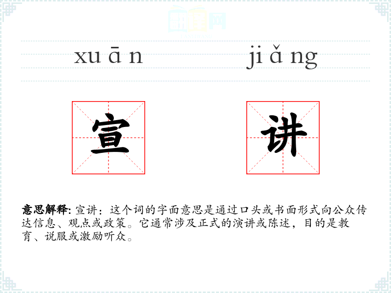 宣讲:这个词的字面意思是通过口头或书面形式向公众传达信息、观点或政策。它通常涉及正式的演讲或陈述,目的是教育、说服或激励听众。