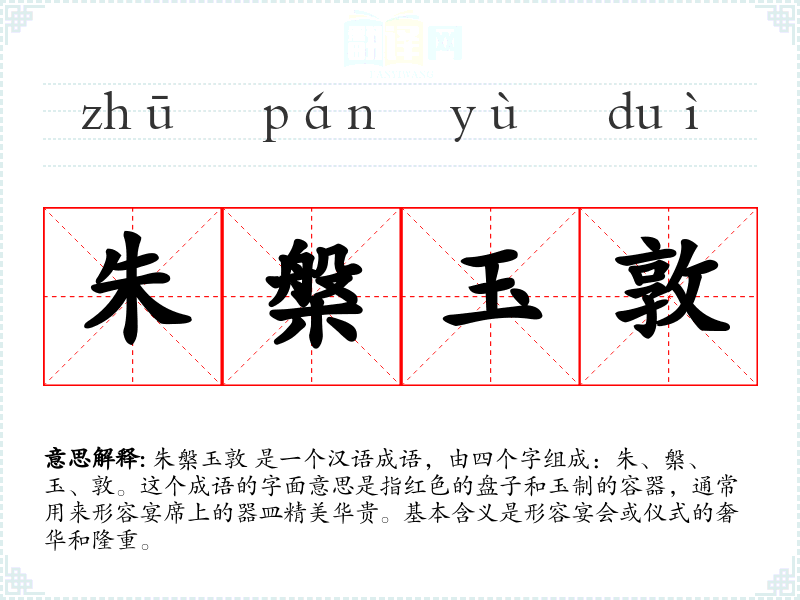 朱槃玉敦 是一个汉语成语,由四个字组成:朱、槃、玉、敦。这个成语的字面意思是指红色的盘子和玉制的容器,通常用来形容宴席上的器皿精美华贵。基本含义是形容宴会或仪式的奢华和隆重。