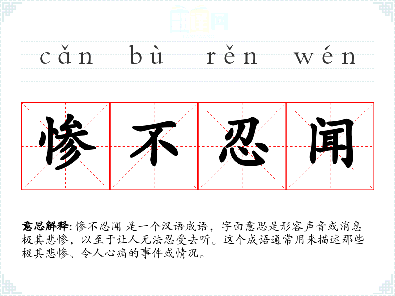 惨不忍闻 是一个汉语成语,字面意思是形容声音或消息极其悲惨,以至于让人无法忍受去听。这个成语通常用来描述那些极其悲惨、令人心痛的**或情况。