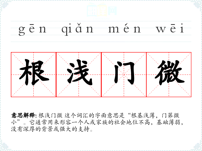 根浅门微 这个词汇的字面意思是“根基浅,门第微小”。它通常用来形容一个人或家族的社会地位不高,基础弱,没有深厚的背景或强大的支持。
