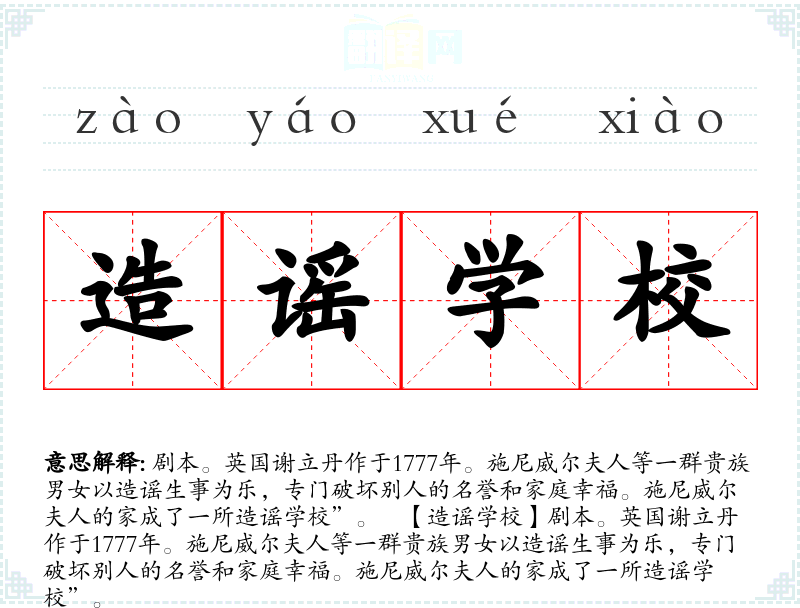 1.剧本。英国谢立丹作于1777年。施尼威尔夫人等一群贵族男女以造谣生事为乐,专门破坏别人的名誉和家庭幸福。施尼威尔夫人的家成了一所造谣学校”。 【造谣学校】剧本。英国谢立丹作于1777年。施尼威尔夫人等一群贵族男女以造谣生事为乐,专门破坏别人的名誉和家庭幸福。施尼威尔夫人的家成了一所造谣学校”。