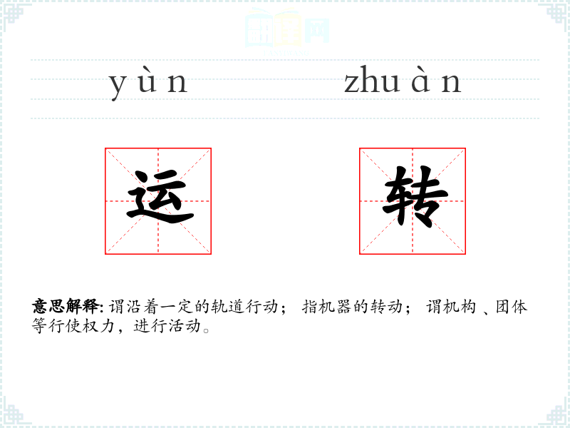 谓沿着一定的轨道行动; 指机器的转动; 谓机构﹑团体等行使权力,进行活动。