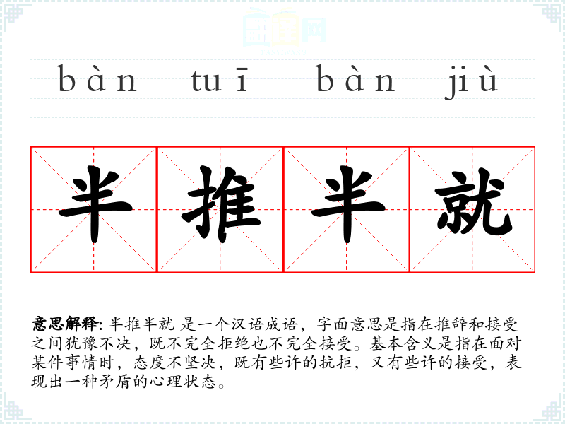 半推半就 是一个汉语成语,字面意思是指在推辞和接受之间犹豫不决,既不完全拒绝也不完全接受。基本含义是指在面对某件事情时,态度不坚决,既有些许的抗拒,又有些许的接受,表现出一种矛盾的心理状态。