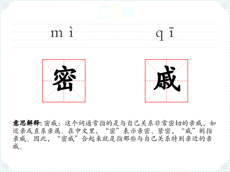 在英语中,“密戚”可以对应为“close relatives”或“immediate family”,虽然在表达上略有不同,但都强调了亲密和直接的亲属关系。