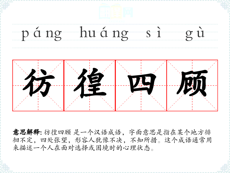 彷徨四顾 是一个汉语成语,字面意思是指在某个地方徘徊不定,四处张望,形容人犹豫不决,不知所措。这个成语通常用来描述一个人在面对选择或困境时的心理状态。