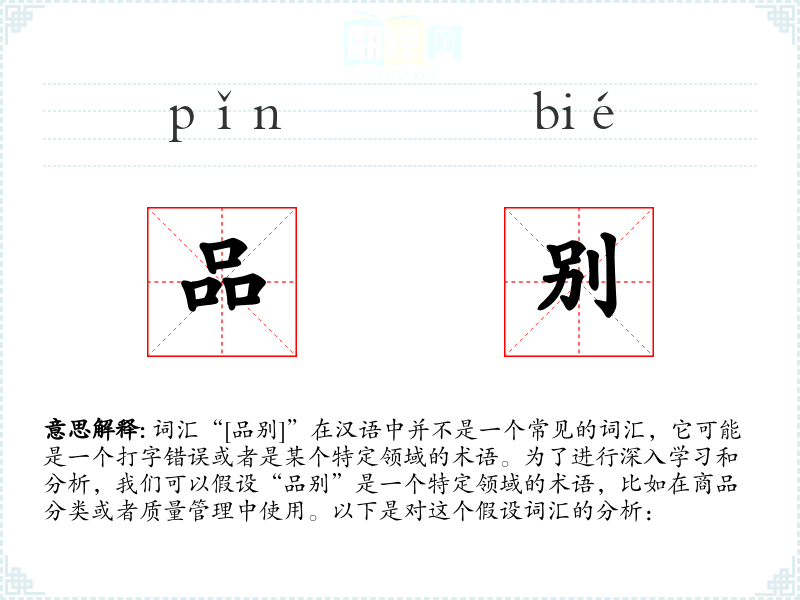 词汇“[品别]”在汉语中并不是一个常见的词汇,它可能是一个打字错误或者是某个特定领域的术语。为了进行深入学习和分析,我们可以假设“品别”是一个特定领域的术语,比如在商品分类或者质量管理中使用。以下是对这个假设词汇的分析: