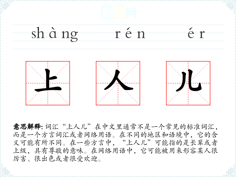 词汇“上人儿”在中文里通常不是一个常见的标准词汇,而是一个方言词汇或者网络用语。在不同的地区和语境中,它的含义可能有所不同。在一些方言中,“上人儿”可能指的是长辈或者上级,具有尊敬的意味。在网络用语中,它可能被用来形容某人很厉害、很出色或者很受欢迎。