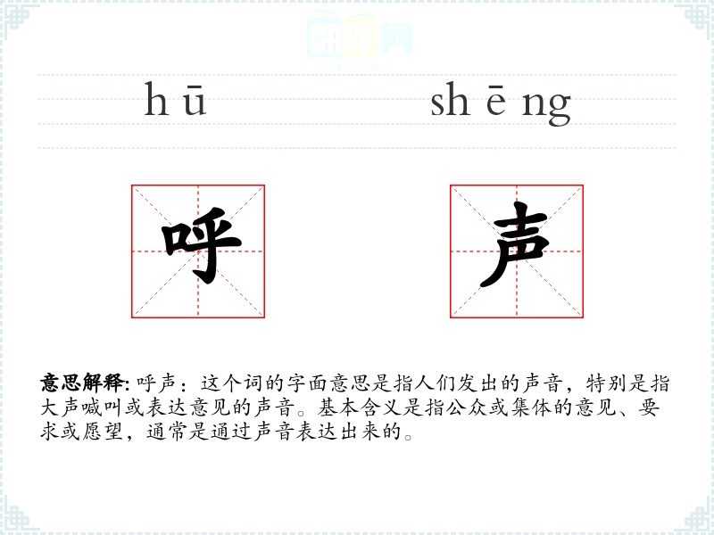 呼声:这个词的字面意思是指人们发出的声音,特别是指大声喊叫或表达意见的声音。基本含义是指公众或集体的意见、要求或愿望,通常是通过声音表达出来的。