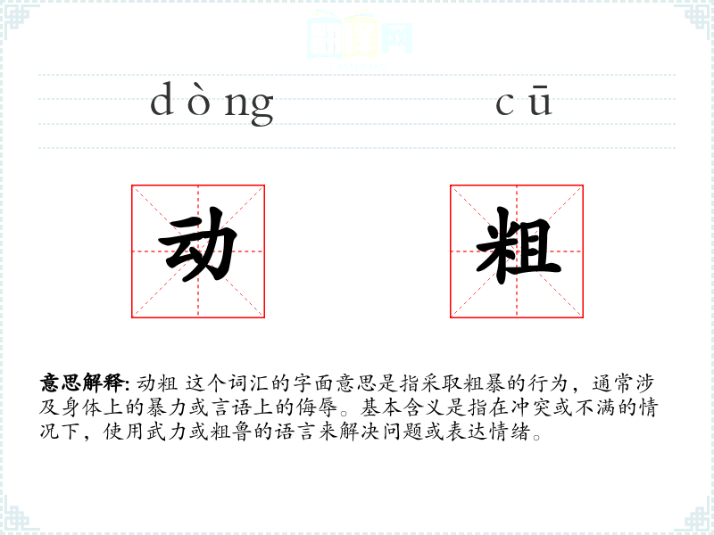 动粗 这个词汇的字面意思是指采取粗暴的行为,通常涉及身体上的暴力或言语上的侮辱。基本含义是指在冲突或不满的情况下,使用武力或粗鲁的语言来解决问题或表达情绪。