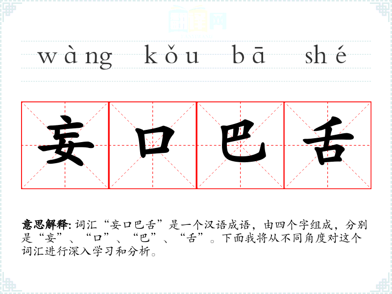 词汇“妄口巴舌”是一个汉语成语,由四个字组成,分别是“妄”、“口”、“巴”、“舌”。下面我将从不同角度对这个词汇进行深入学*和分析。