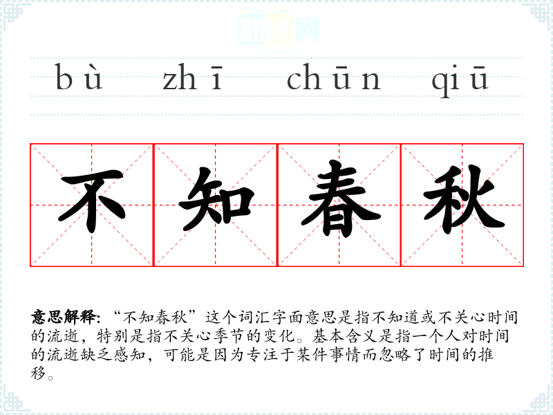 “不知春秋”这个词汇字面意思是指不知道或不关心时间的流逝,特别是指不关心季节的变化。基本含义是指一个人对时间的流逝缺乏感知,可能是因为专注于某件事情而忽略了时间的推移。