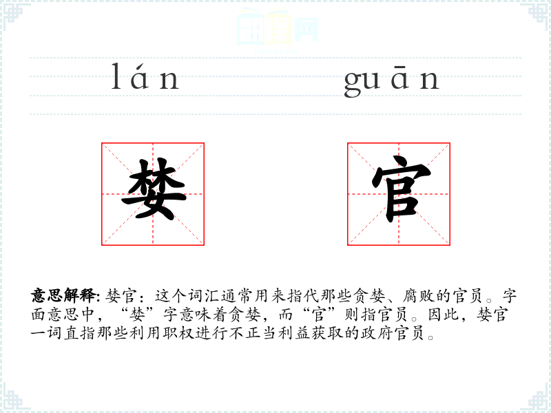 婪官:这个词汇通常用来指代那些贪婪、腐败的官员。字面意思中,“婪”字意味着贪婪,而“官”则指官员。因此,婪官一词直指那些利用职权进行不正当利益获取的政府官员。