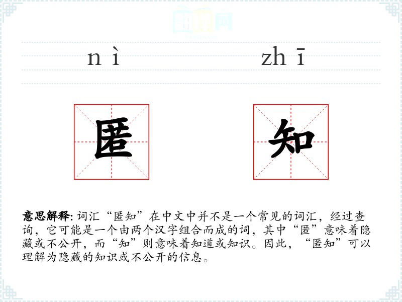词汇“匿知”在中文中并不是一个常见的词汇,经过查询,它可能是一个由两个汉字组合而成的词,其中“匿”意味着隐藏或不公开,而“知”则意味着知道或知识。因此,“匿知”可以理解为隐藏的知识或不公开的信息。