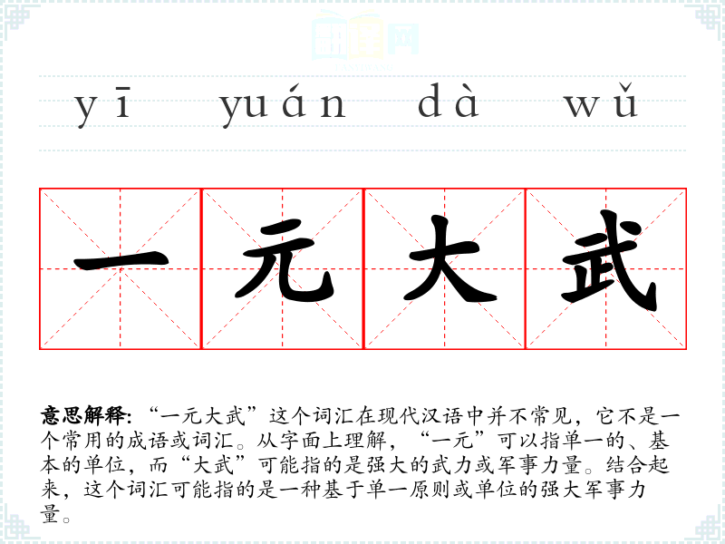 “一元大武”这个词汇在现代汉语中并不常见,它不是一个常用的成语或词汇。从字面上理解,“一元”可以指单一的、基本的单位,而“大武”可能指的是强大的武力或军事力量。结合起来,这个词汇可能指的是一种基于单一原则或单位的强大军事力量。