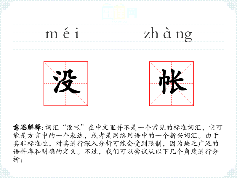 由于“没帐”不是一个标准词汇,它的字面意思和基本含义可能需要根据具体的语境来解释。在一些方言中,“没帐”可能意味着“没有问题”、“没关系”或“不用计较”。