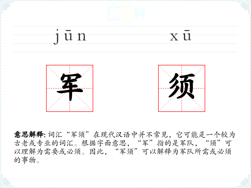 - 理解:“军须”是一个具有历史和文化背景的词汇,虽然在现代汉语中不常用,但在学习和研究军事历史时仍然具有一定的价值。