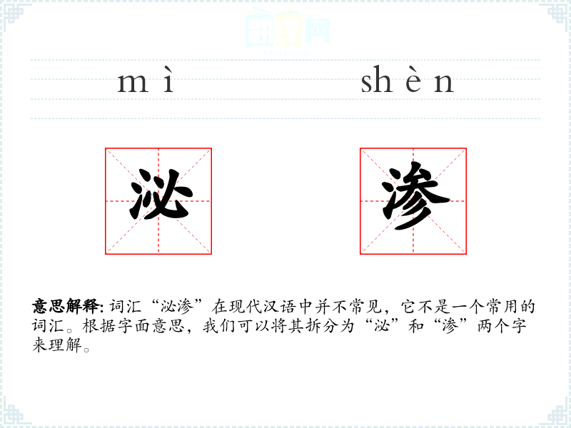 词汇“泌渗”在现代汉语中并不常见,它不是一个常用的词汇。根据字面意思,我们可以将其拆分为“泌”和“渗”两个字来理解。