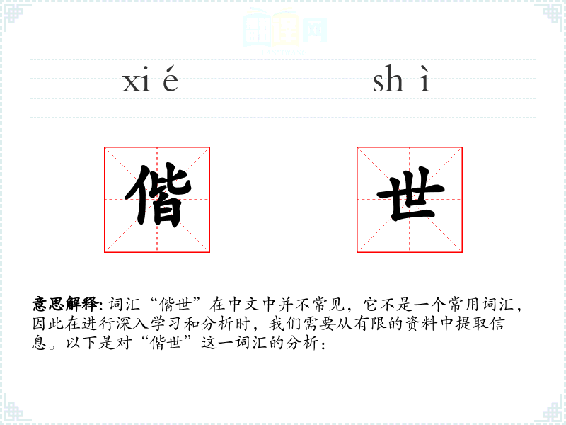 词汇“偕世”在中文中并不常见,它不是一个常用词汇,因此在进行深入学*和分析时,我们需要从有限的资料中提取信息。以下是对“偕世”这一词汇的分析: