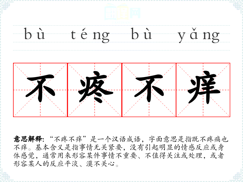 “不疼不痒”是一个汉语成语,字面意思是指既不疼痛也不痒。基本含义是指事情无关紧要,没有引起明显的情感反应或身体感觉,通常用来形容某件事情不重要、不值得关注或处理,或者形容某人的反应平淡、漠不关心。
