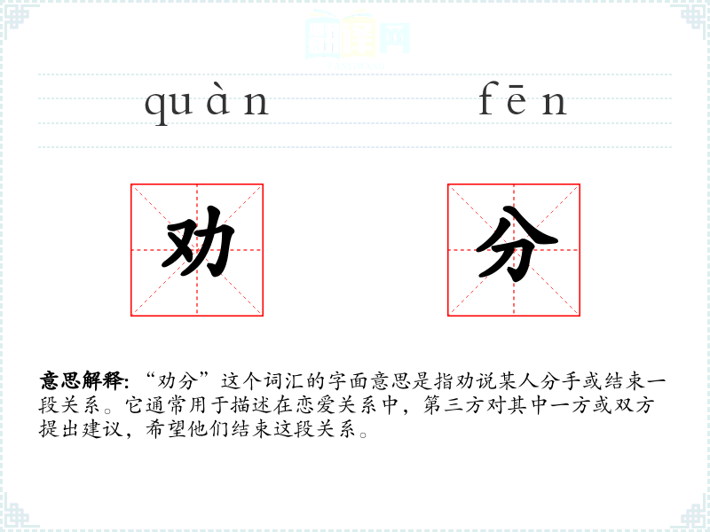 “劝分”这个词汇在中文中的使用历史相对较短,主要在现代社会中随着人际关系的复杂化而逐渐流行起来。它的词源直接来源于“劝说”和“分手”两个词汇的结合。