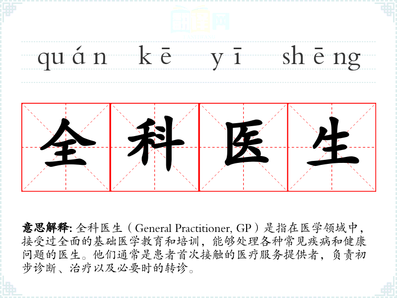 - 反义词:专科医生(Specialist),如心脏病专家、儿科医生等,他们专注于某一特定领域的疾病治疗。