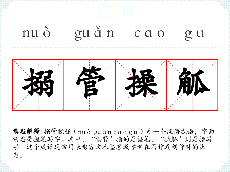 搦管操觚(nuò guǎn cāo gū)是一个汉语成语,字面意思是握笔写字。其中,“搦管”指的是握笔,“操觚”则是指写字。这个成语通常用来形容文人墨客或学者在写作或创作时的状态。